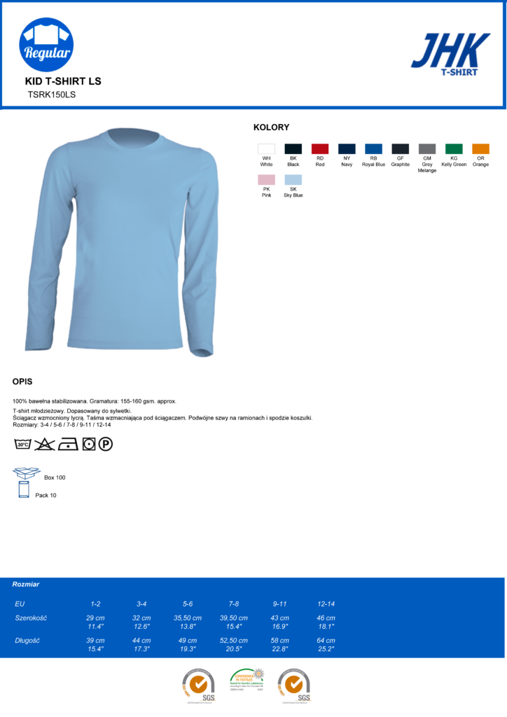 T-shirt młodzieżowy J-150K LS z długim rękawem bez ściągaczy