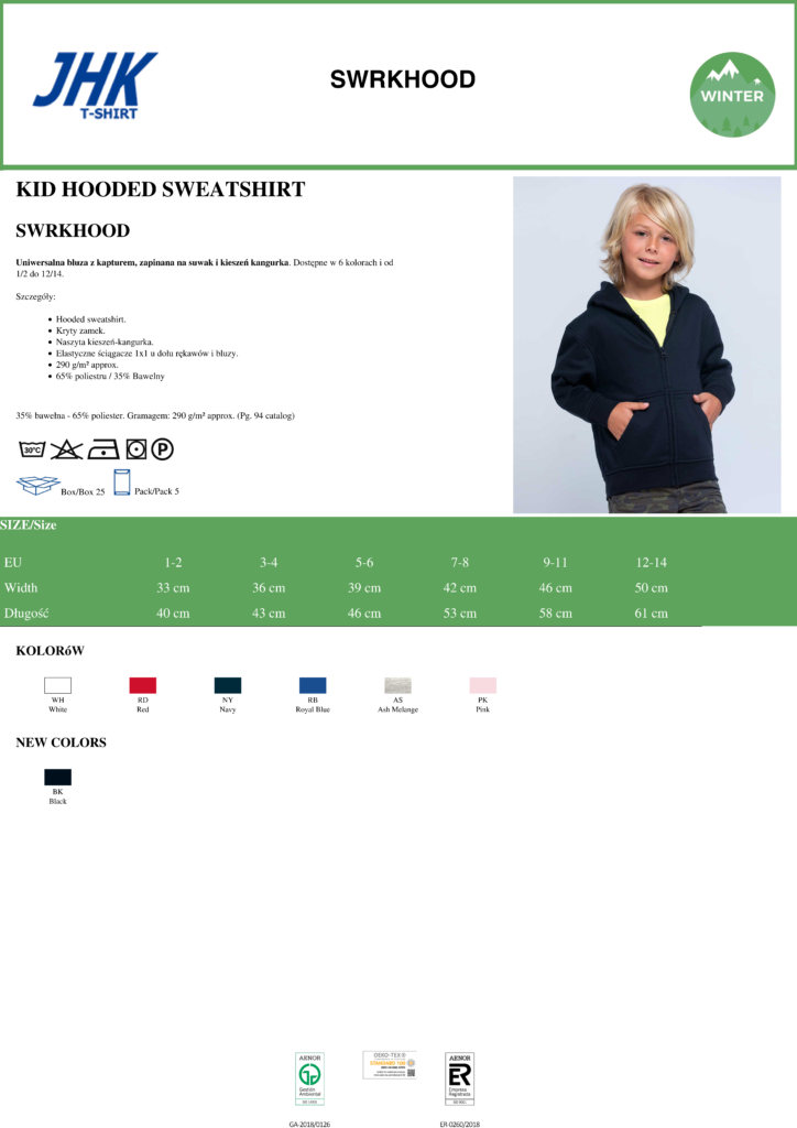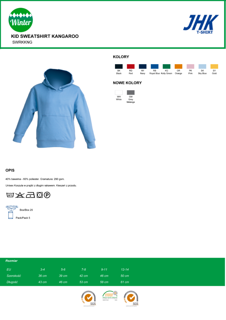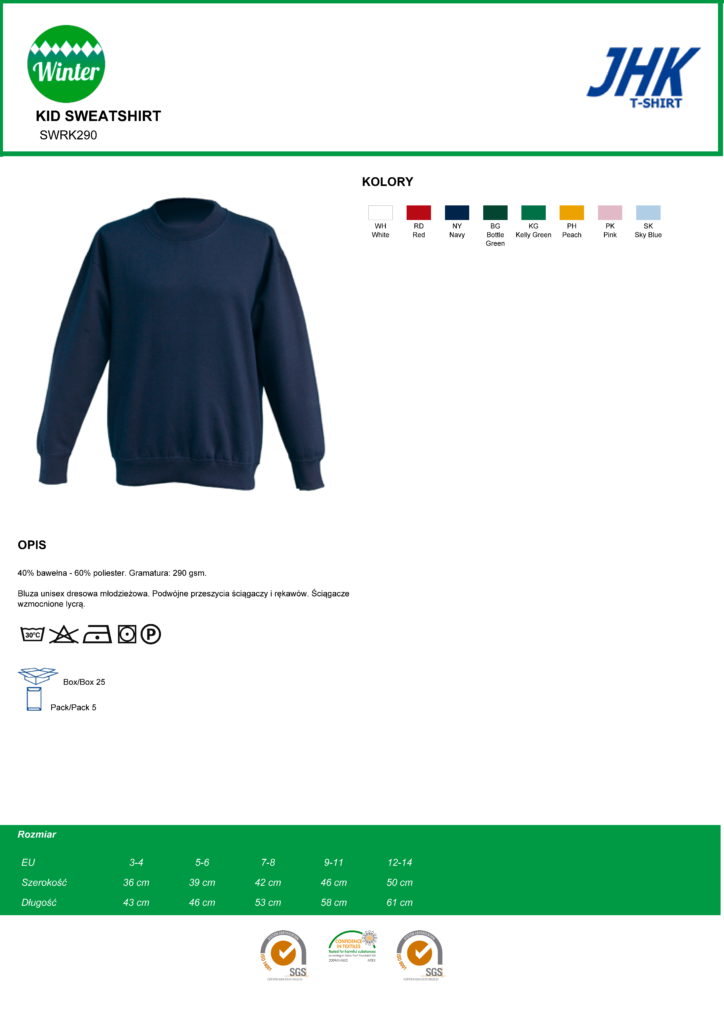 Podwójne przeszycia ściągaczy i rękawów. Ściągacze wzmocnione lycrą.Skład: 40% bawełna – 60% poliester.Gramatura: 290gRozmiary: 3-4 / 5-6 / 7-8 / 9-11 / 12-14