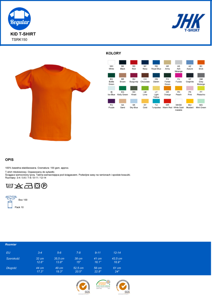 Dopasowany do sylwetki. Ściągacz wzmocniony lycrą. Taśma wzmacniająca pod ściągaczem. Podwójne szwy na ramionach i spodzie koszulki. 100% bawełna stabilizowana.Gramatura: 155g/m2Rozmiary: 3-4 / 5-6 / 7-8 / 9-11 / 12-14GM – 85% bawełna / 15% wiskozaAS – 98% bawełna / 2% wiskoza