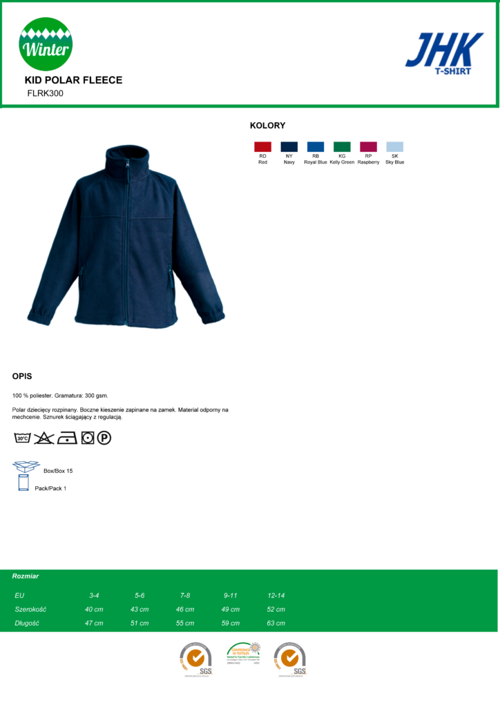 Kieszenie również zapinane na suwak.Mikro polar z wykończeniem antypilingowym. Sznurek ściągający z regulacją. 100% poliester.Gramatura: 300 gr.Rozmiary: 3-4 / 5-6 / 7-8 / 9-11 / 12-14