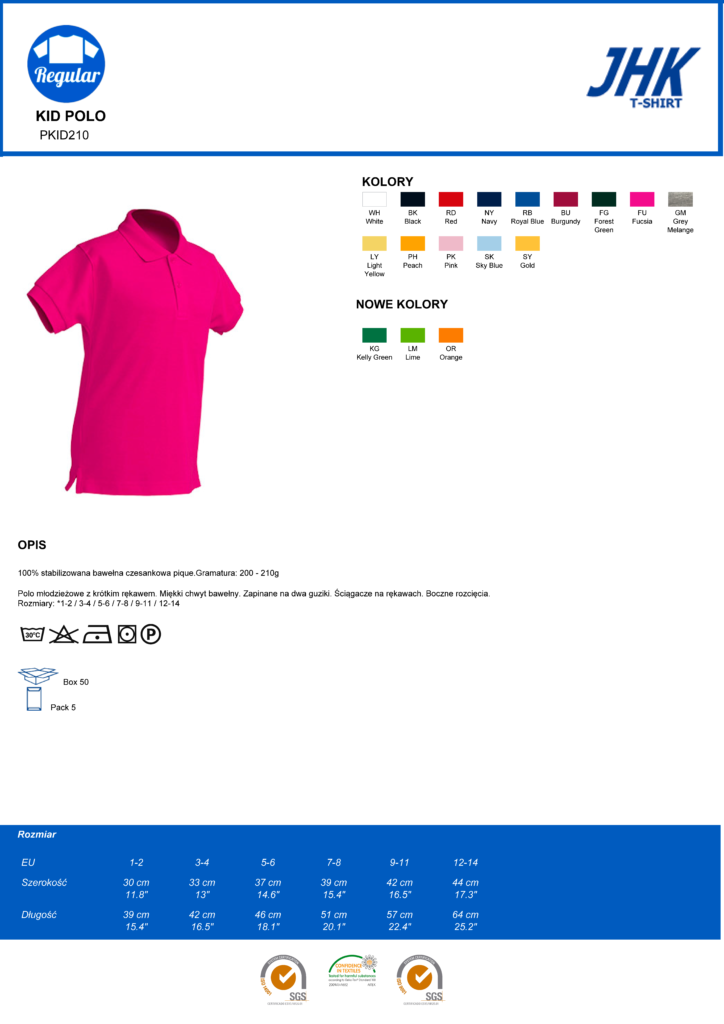 Zapinane na dwa guziki. Ściągacze na rękawach. Boczne rozcięcia. Łatwo usuwalna metka. 100% stabilizowana bawełna czesankowa pique.Gramatura: 210g/m2Rozmiary: 3-4 / 5-6 / 7-8 / 9-11 / 12-14